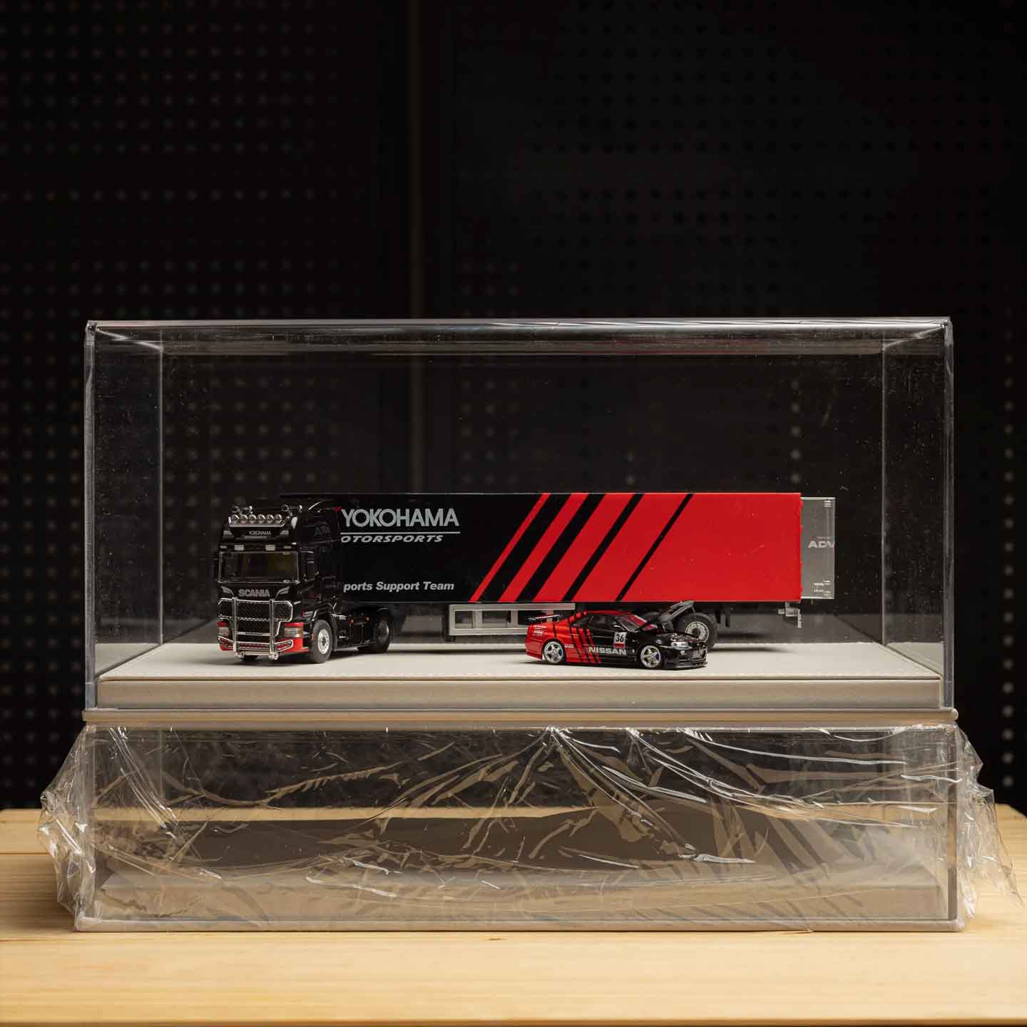 Perfect for transporting or displaying 1:64 scale cars, this container carrier includes a removable container, rolling wheels, and fine detailing throughout. A must-have accessory for collectors who love Advan-themed cars or Japanese racing setups.